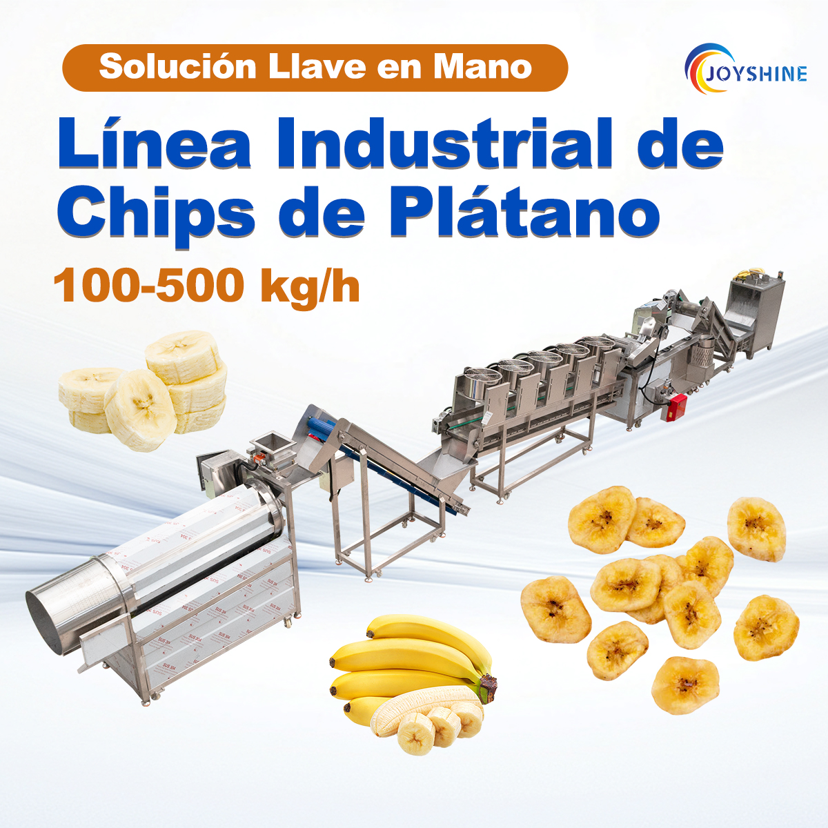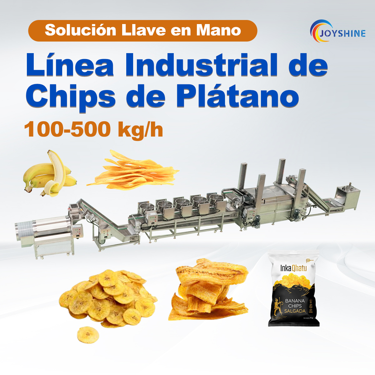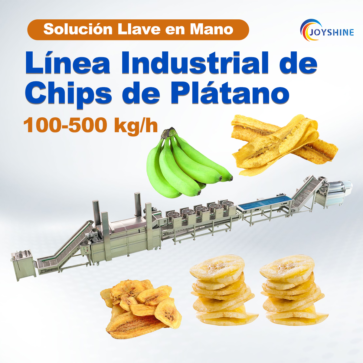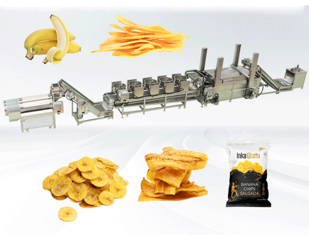 Máquina peladora de plátanos→rebanadora de plátano industrial→freidora industrial→desaceitador por vibración→secador de aire→máquina automática de pesaje y envasado