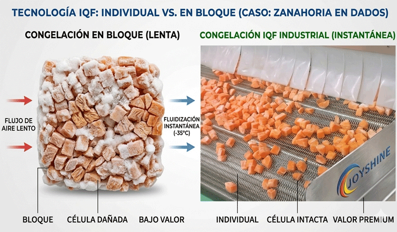 En el procesamiento moderno de alimentos, la tecnología IQF (Individual Quick Freezing) redefine la frescura. A diferencia de la "Congelación en Bloque" tradicional, el IQF garantiza que cada pieza (ya sean guisantes, camarones o cubos de mango) se mantenga completamente independiente y sin apelmazarse durante el proceso.